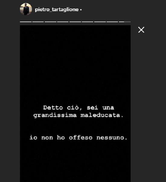 Nella stories successiva, Pietro Tartaglia ha aggiunto: “Detto ciò, sei una grandissima maleducata. Io non ho offeso nessuno”. Giulia De Lellis ha cancellato poi il suo post. Sarà guerra tra i due?