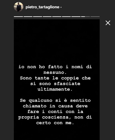 Sul profilo ufficiale Pietro Tartaglione ha postato una stories nella quale parlava delle coppie finte, senza specificare nomi o situazioni particolari. Nella stories, l’ex corteggiatore di Uomini e Donne ha scritto: “Ma la smettete di ‘fidanzarvi’ solo per le copertine? Che poi durate 15 giorni?” – poi continua – “La gente a casa non è stupida”.