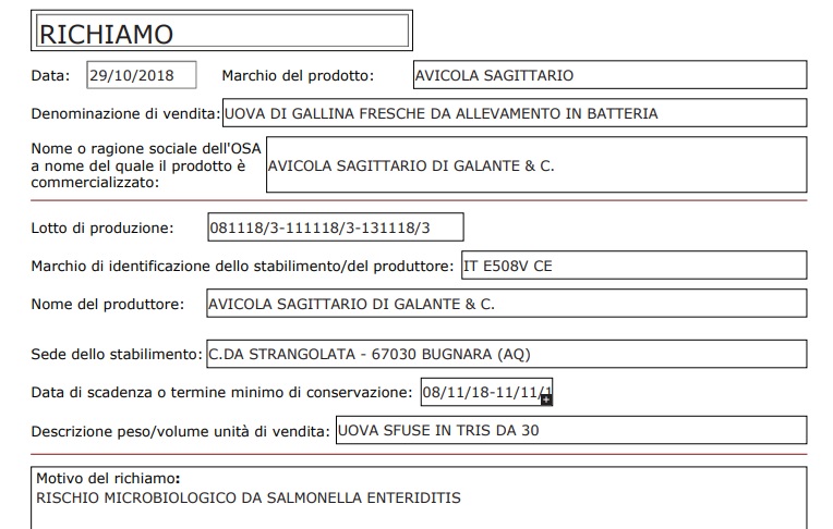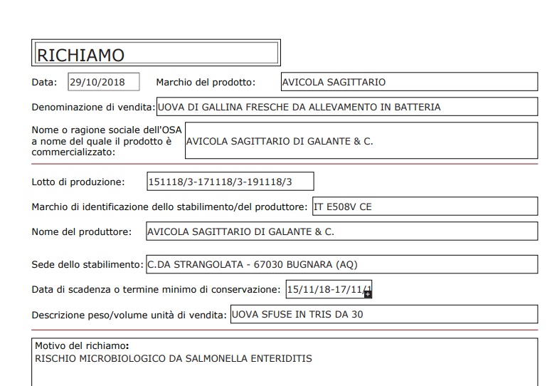 Un altro avviso ministeriale, invece, riguarda i prodotti a marchio Avicola Sagittario e sono i numero 1511188/3, poi 171118/3 e anche il 191118/3. Le confezioni sono da 3o pezzi e la scadenza è relativa ai periodi del 15/11/18, 17/11/18 e 19/11/18.