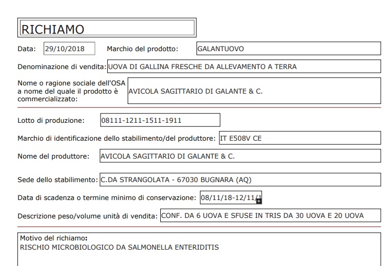 I lotti di uova richiamati sono molteplici e sono tutti provenienti dallo stabilimento La Avicola Sagittario di Galante & C., sito a Bugnara, in provincia di L’Aquila. Il marchio delle uova fresche ritirate del Ministero della Salute è diverso per i vari lotti, ma la provenienza dell’alimento è sempre in riferimento allo stesso stabilimento aquilano.