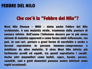Tra le tante problematiche da affrontare ogni giorno nel nostro Paese, di recente si è aggiunto l’incubo del contagio da “febbre del Nilo” un virus che in certi casi può diventare letale e che si sta manifestando in varie Regioni; le ultime notizie in merito arrivano da Pordenone dove un uomo di 69 anni di Prata di Pordenone, era stato ricoverato con febbre alta provocata dal virus West Nile; l’uomo è deceduto nel reparto di Medicina dell’ospedale di Pordenone.